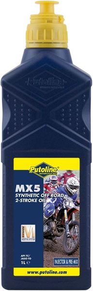 MX5 is een verfijnde synthetische 2-takt off road olie wordt aanbevolen voor gebruik in MotoCross- en enduro motoren. Intensief getest op banen waar dan ook ter wereld zorgt MX5 voor optimale onderdeel bescherming. Zijn synthetische samenstelling voorkomt schadelijke koolaanslag op zuigers, cilinders en power valve systemen en zorgt tegelijkertijd voor een uitstekende oliefilm sterkte en druk opname vermogen.